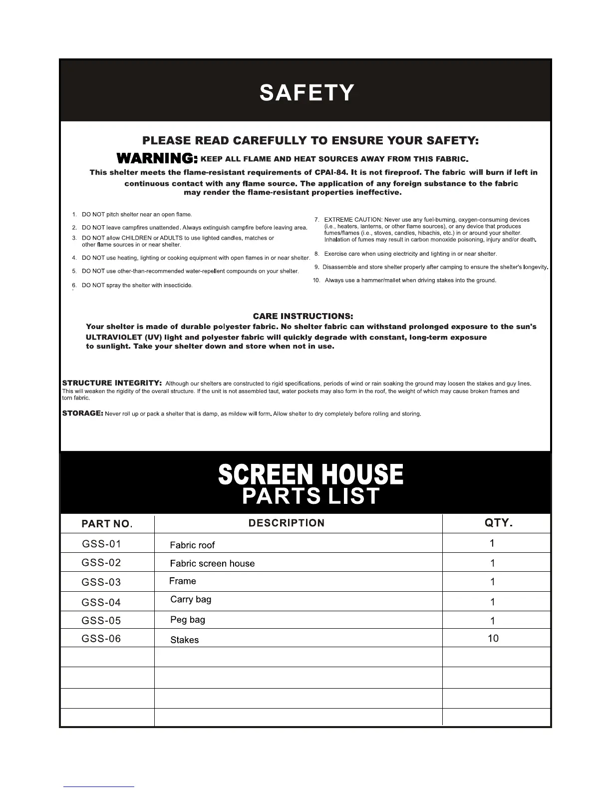 Outbound 299-2939-6 - Safety Instructions; Care Instructions; Structure Integrity; Storage Guidelines