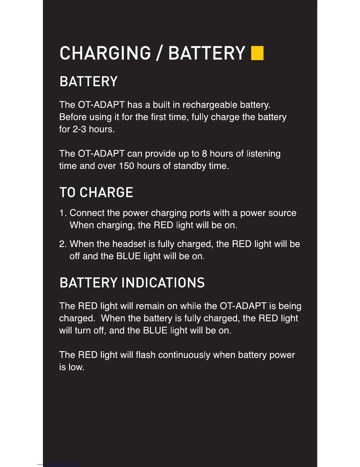 Outdoor Tech ADAPT - CHARGING; BATTERY; BATTERY; TO CHARGE; BATTERY INDICATIONS