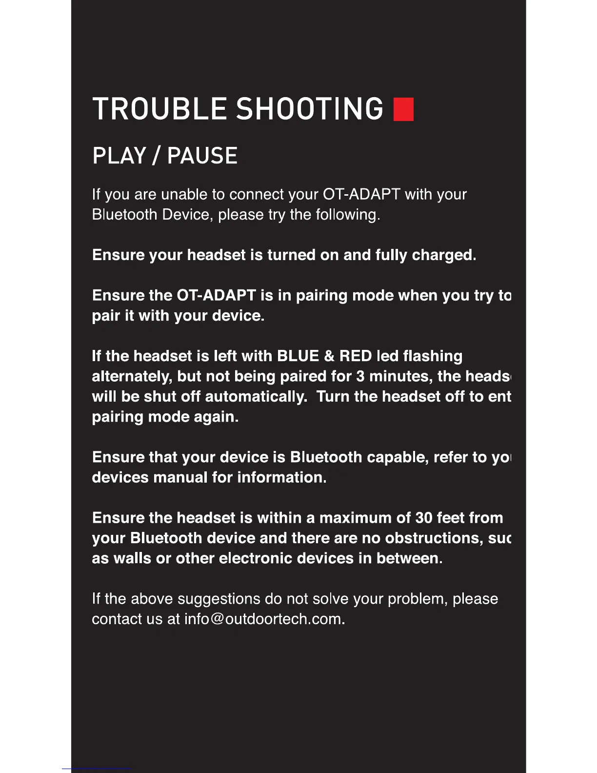 Outdoor Tech ADAPT - TROUBLE SHOOTING; PLAY; PAUSE