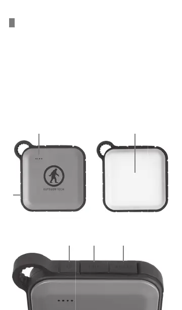 Outdoor Tech FUEL+ - ANATOMY; Battery Indicators and Shock-Proof Bumper; Lantern and Power Controls; Charging Ports Overview