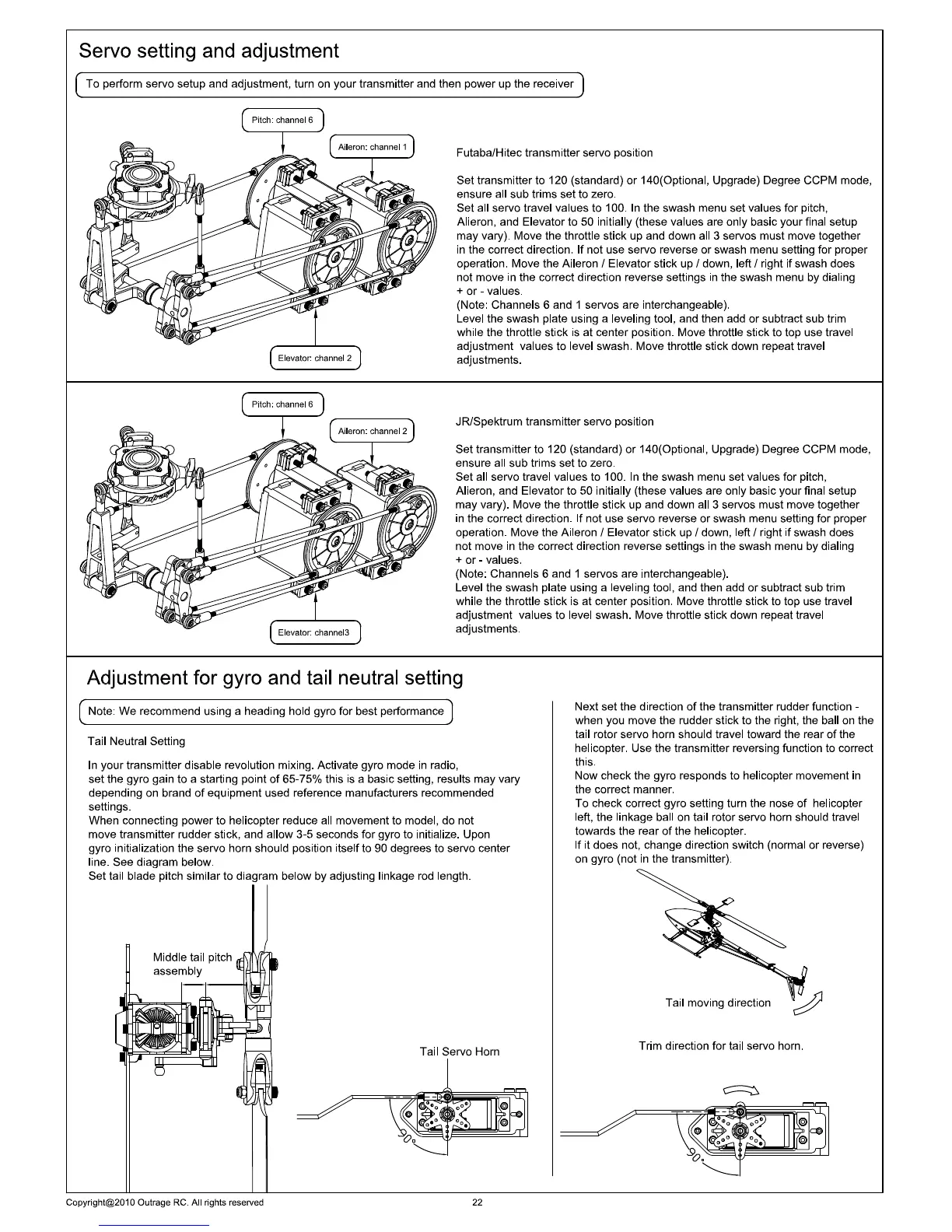 Outrage RC Fusion 50 - Servo Setting and Adjustment; Futaba;Hitec Transmitter Servo Position; JR;Spektrum Transmitter Servo Position; Adjustment for Gyro and Tail Neutral Setting