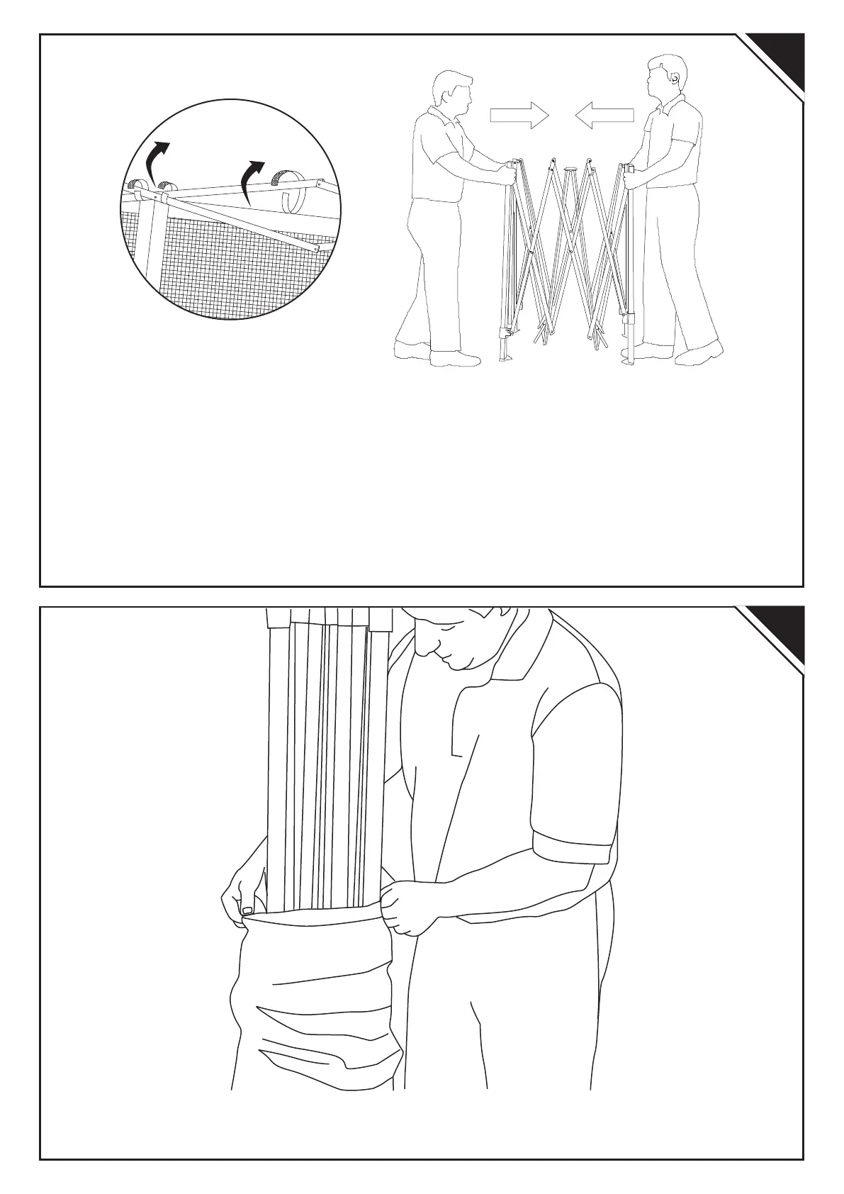EN: Remove elastic loops on the top from each eve extension corner. Stand opposite a