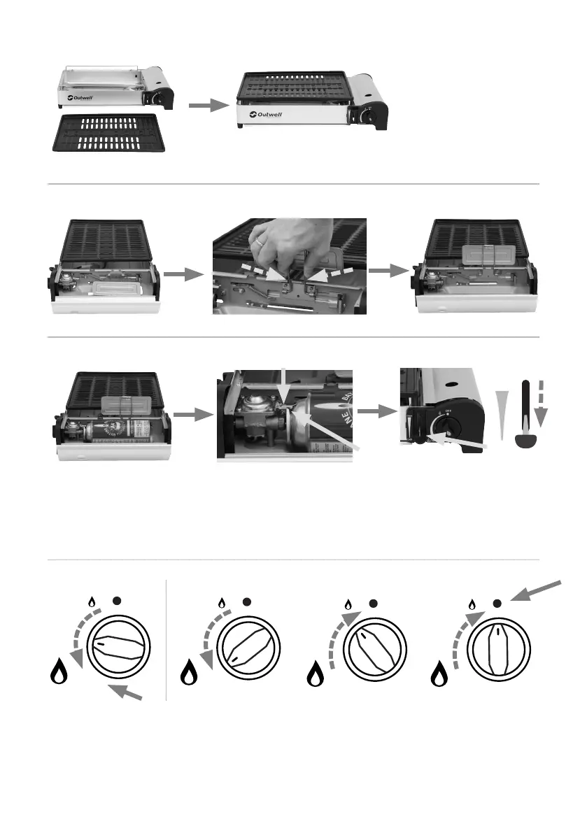 c.) Flammen gøres mindre ved at dreje betjeningsknappen med uret, hen mod det lille flammesymbol.