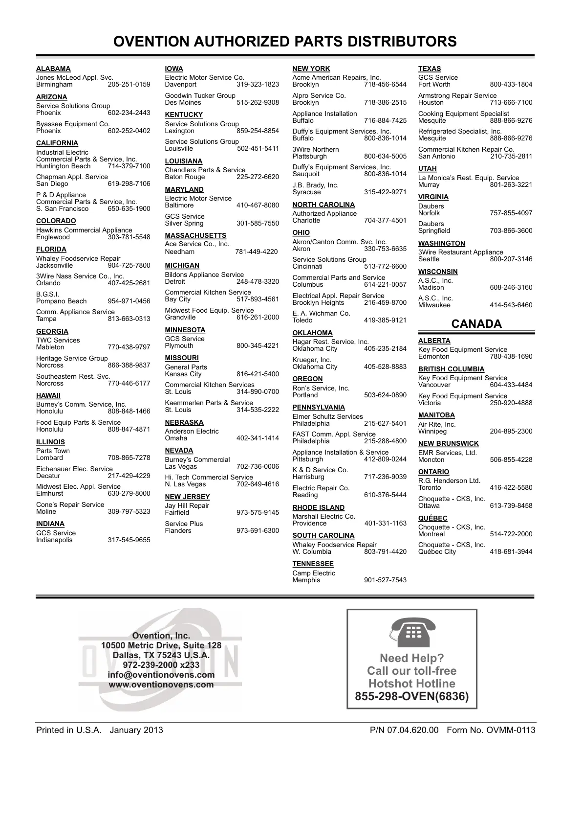 Printed in U.S.A. January 2013 P/N 07.04.620.00 Form No. OVMM-0113