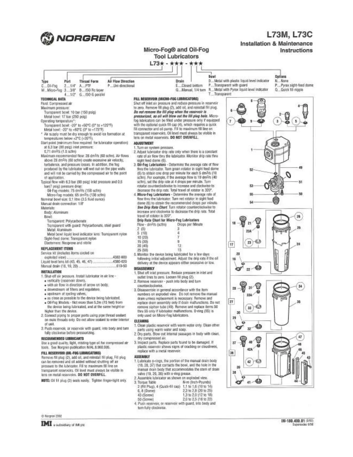 OverBuilt 10 - Norgren L73 M;L73 C Lubricators; Norgren Lubricator Technical Data; Norgren Lubricator Adjustment and Cleaning