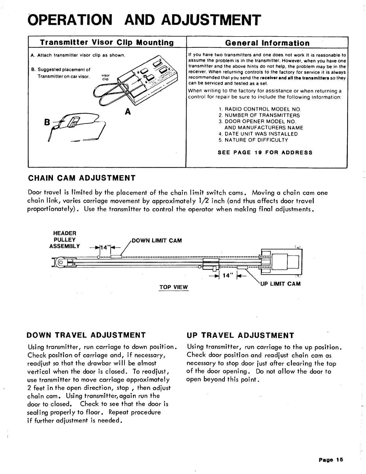 Overhead door 65A - Chain Cam Adjustment; Down Travel Adjustment; Up Travel Adjustment