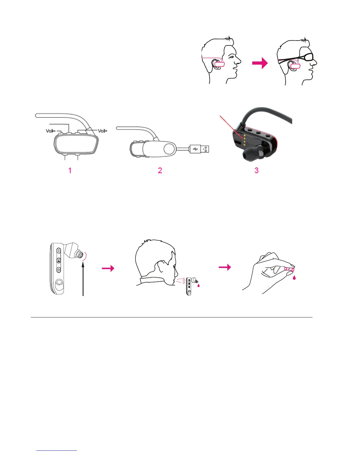 Metoda stabilnego mocowania: Załóż okulary pływackie tak, by docisnąć zaczep słuchawki w punkcie blisko ucha.