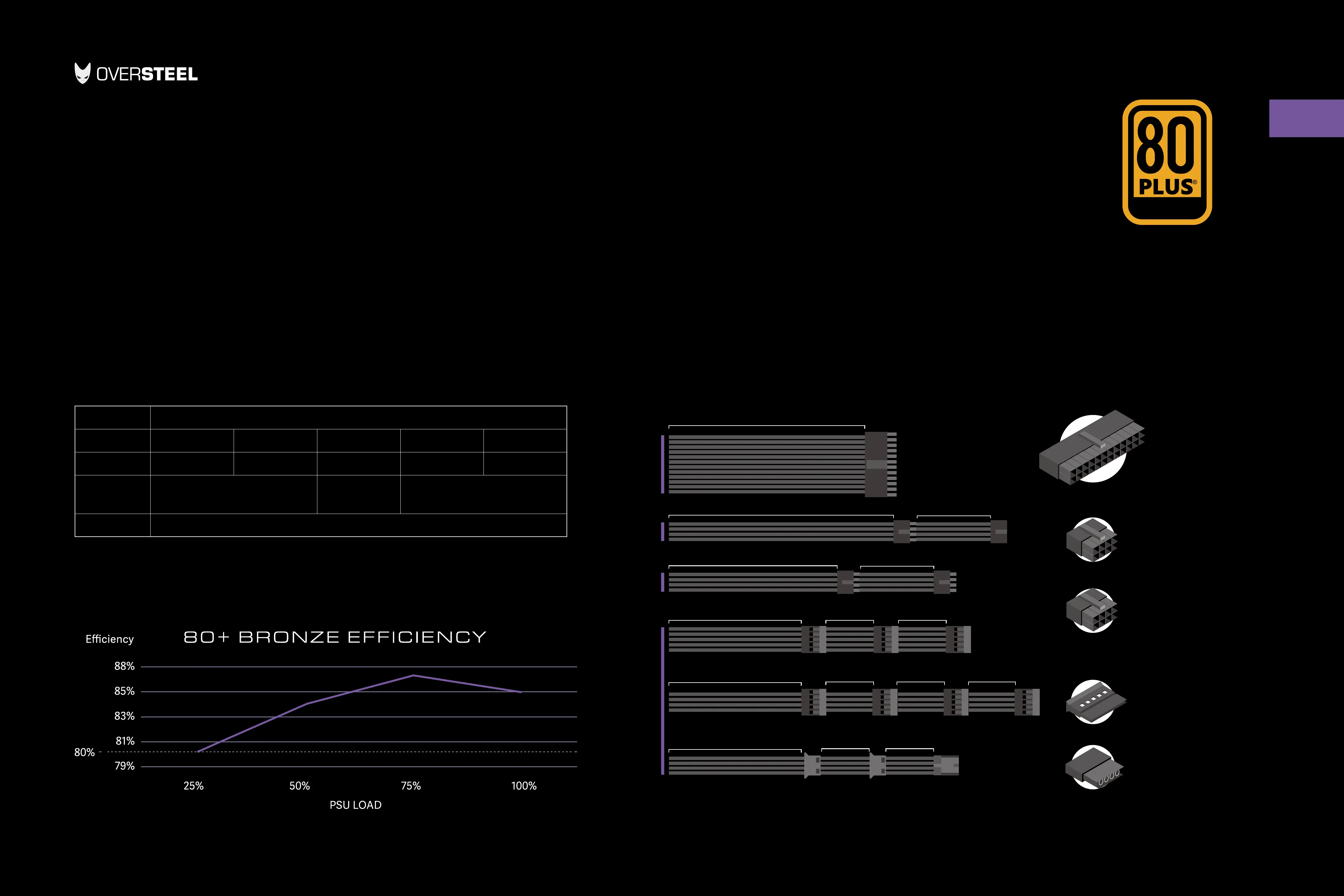 Oversteel QUANTUM - Quantum 750 W Specifications; Power table; Power efficiency; Cable Listing