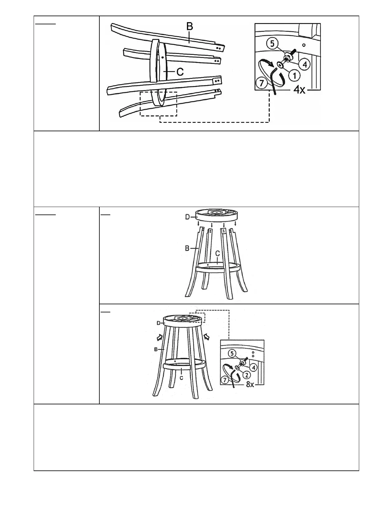3.2 Then, affix the Wooden Leg (B) and Swivel Plate (D) with Bolt② , Spring Washer④ , Flat Washer …⑤