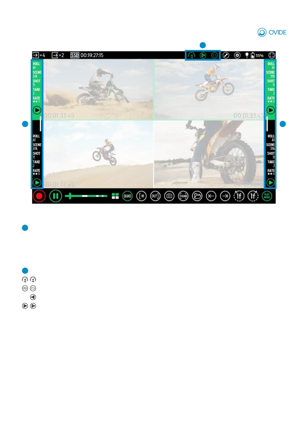 Sidebars: Shows clip metadata (roll, scene, shot, take, rating & fps) for each view on its side.