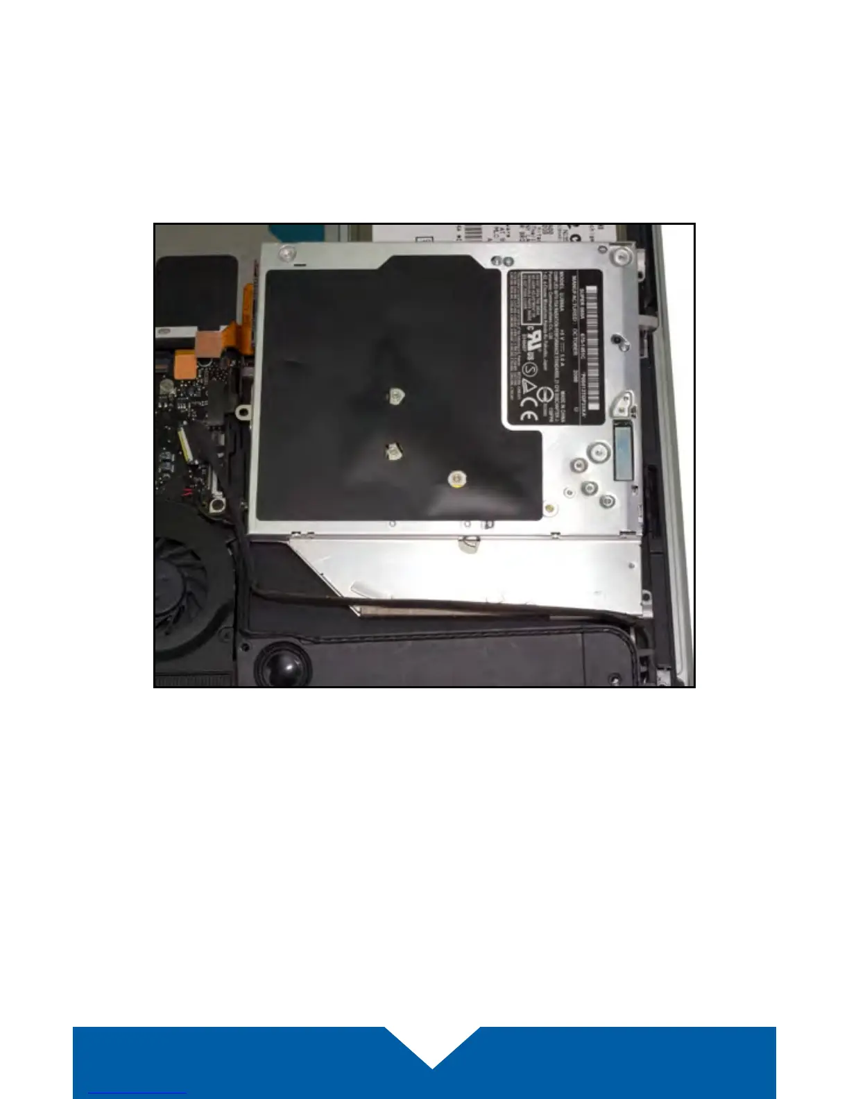 13. Carefully lift the edge of the optical drive nearest the orange ribbon cable,