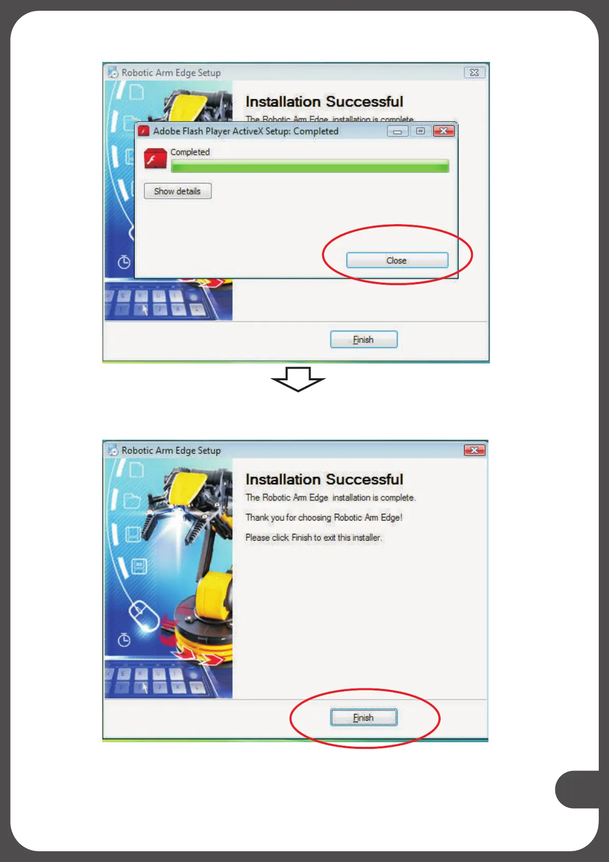 OWI Edge - Step 14: Close Flash Player Setup; Step 15: Finish Program Setup