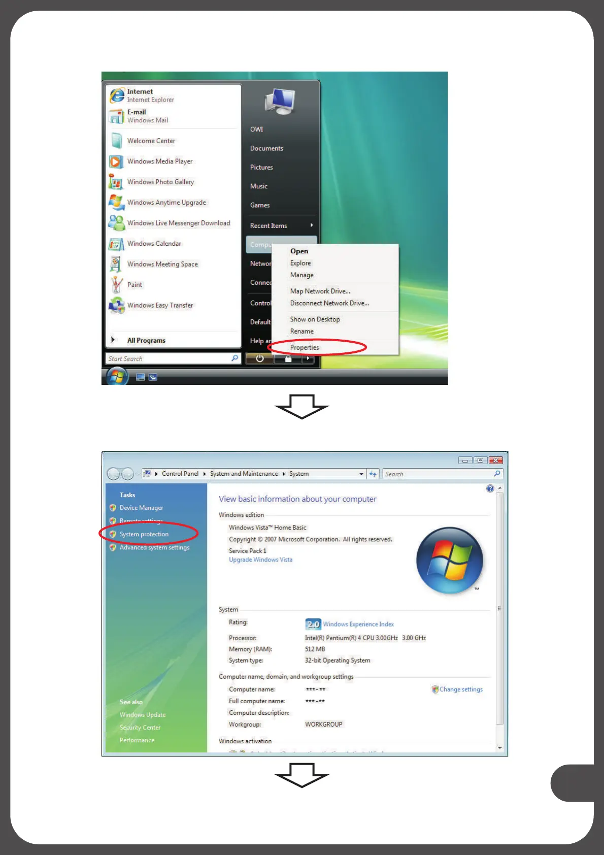 OWI Edge - VISTA: Step 2 - Open System Properties; VISTA: Step 3 - Open System Protection