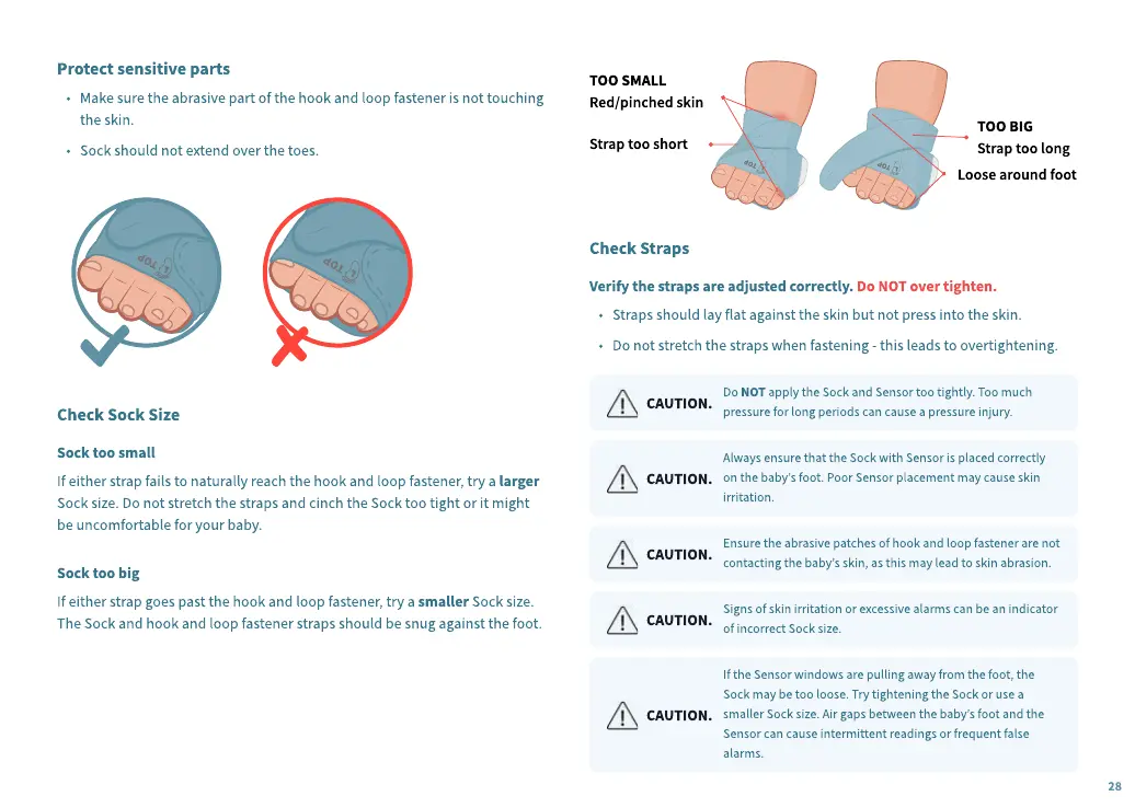 The Sock and hook and loop fastener straps should be snug against the foot.