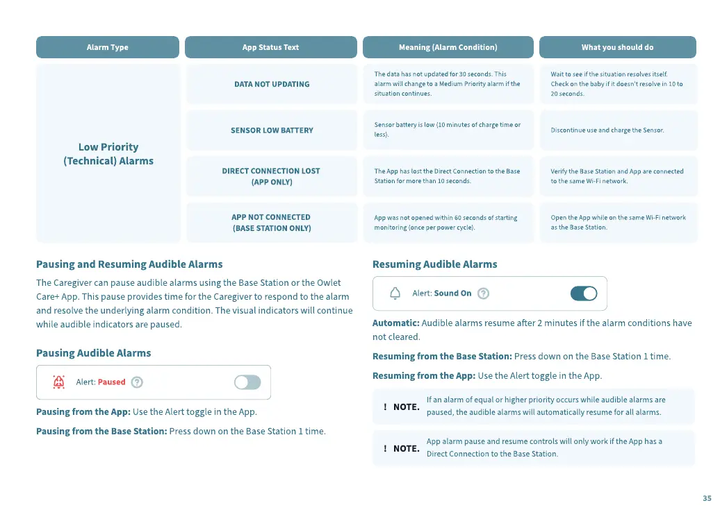 The Caregiver can pause audible alarms using the Base Station or the Owlet