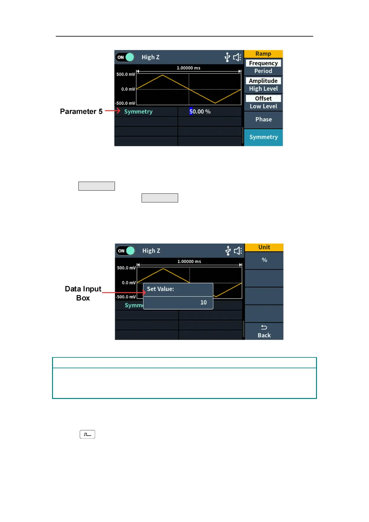 Symmetry: Sets the percentage of the period during which the ramp waveform