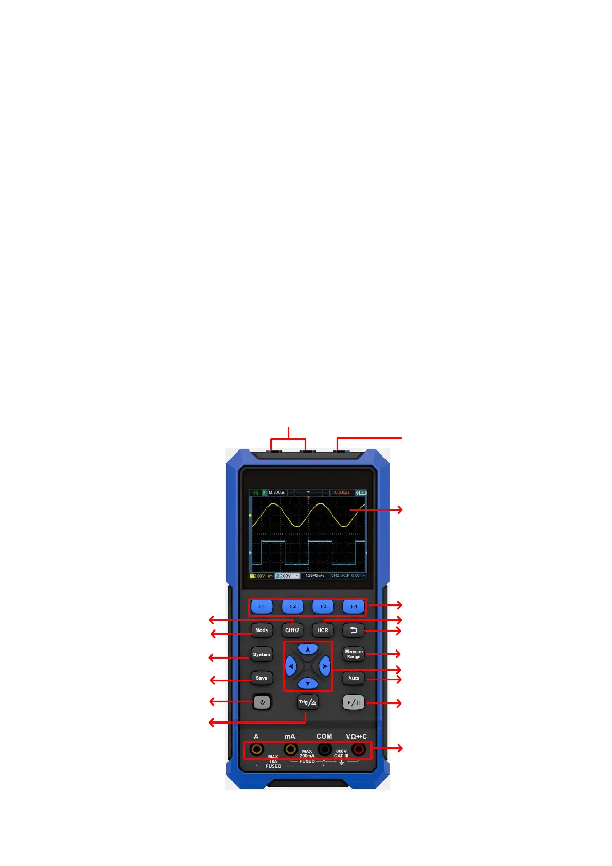 The front panel and keys of the oscilloscope are shown in Figure 4: