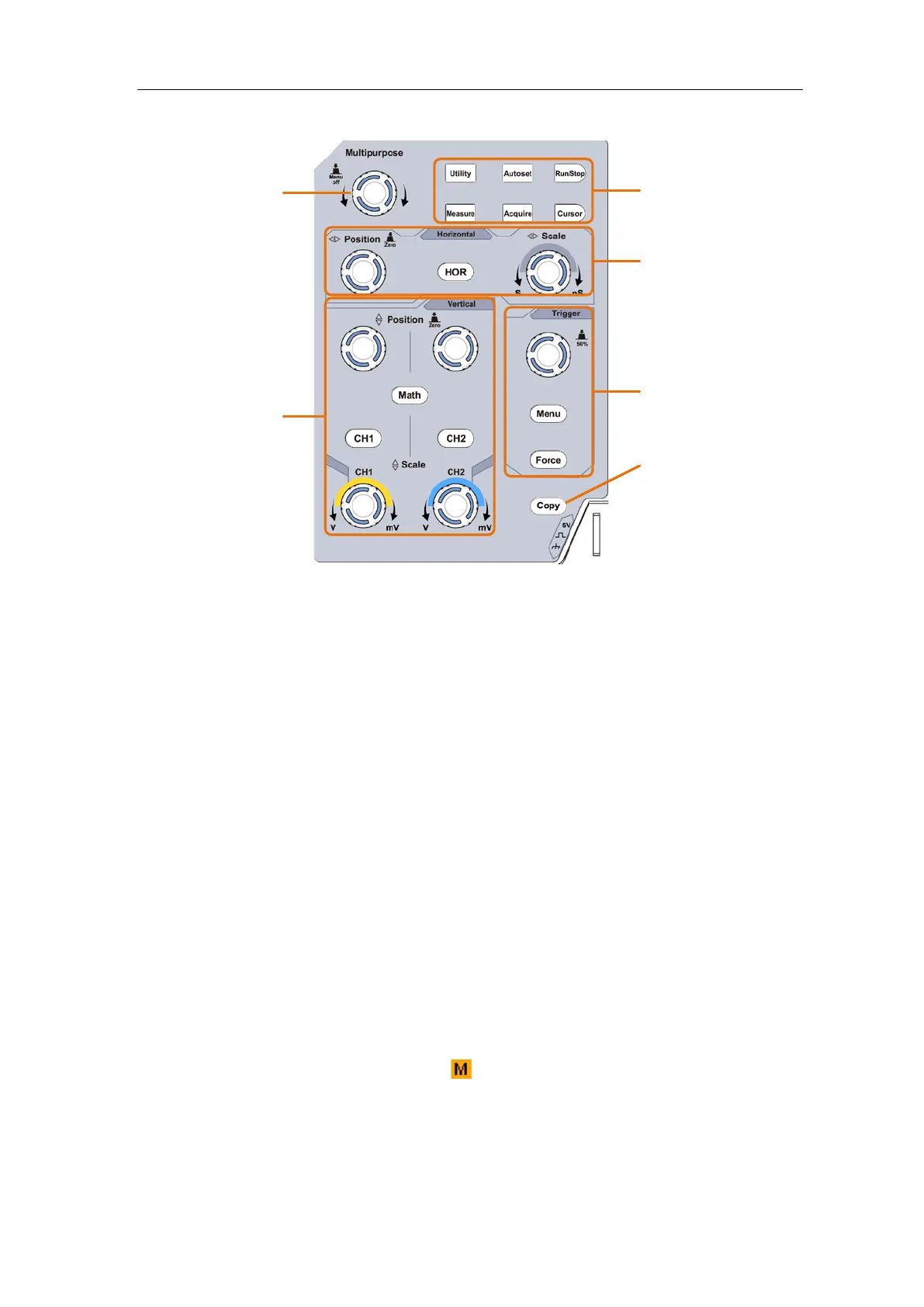 "CH1" and "CH2 " correspond to setting menu in CH1 and CH2, "Math" button refer