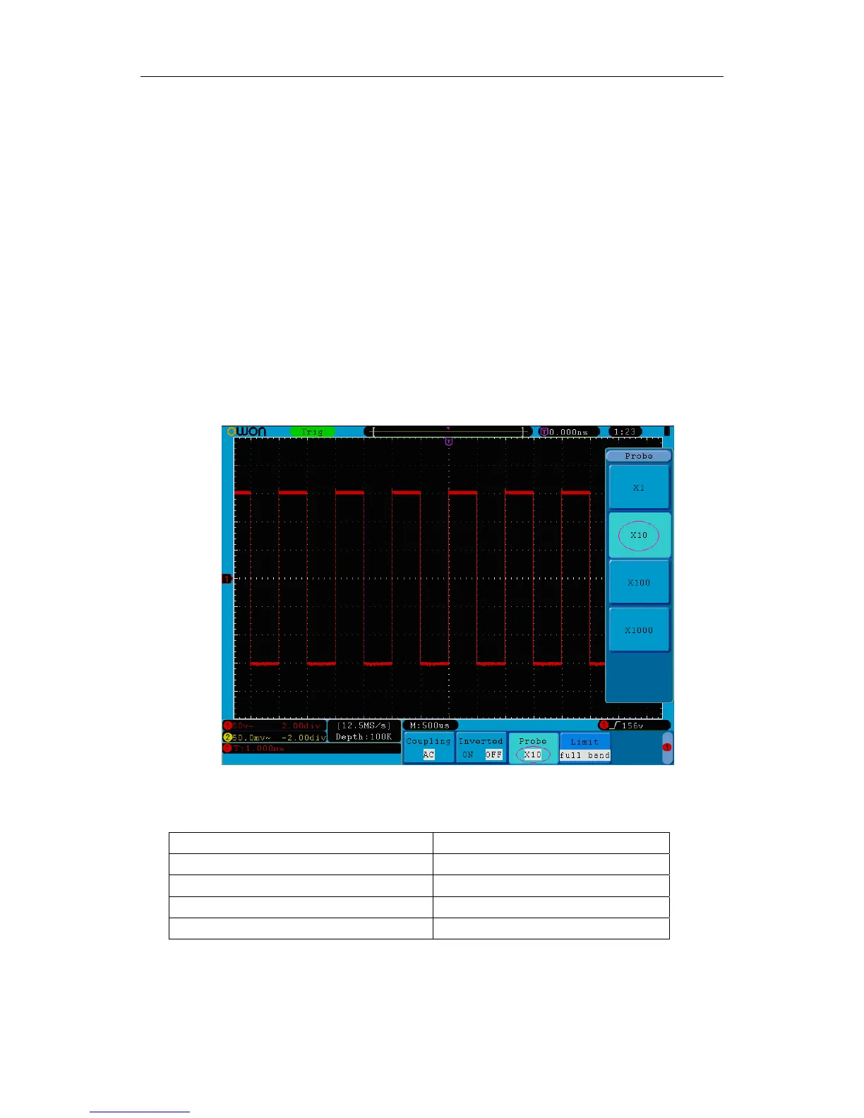 Take the Channel 1 as an example, the attenuation coefficient of the probe is 10:1,
