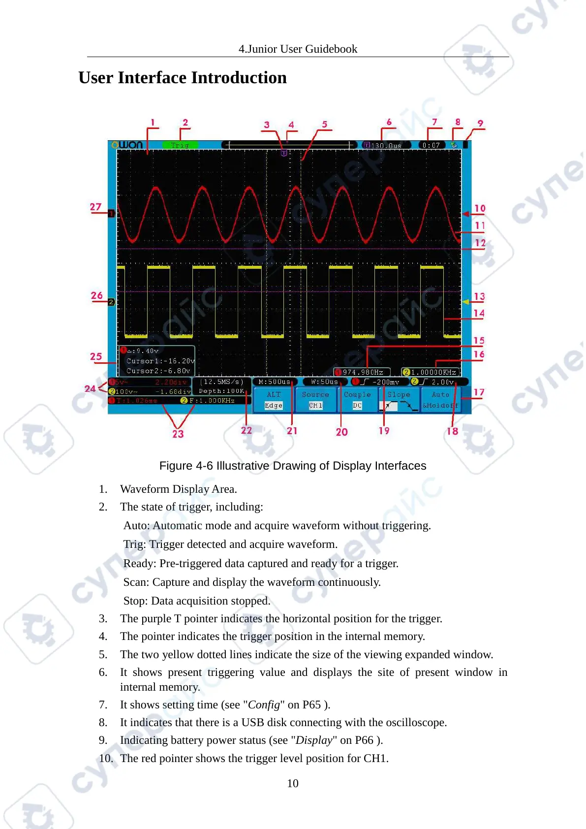 10. The red pointer shows the trigger level position for CH1.