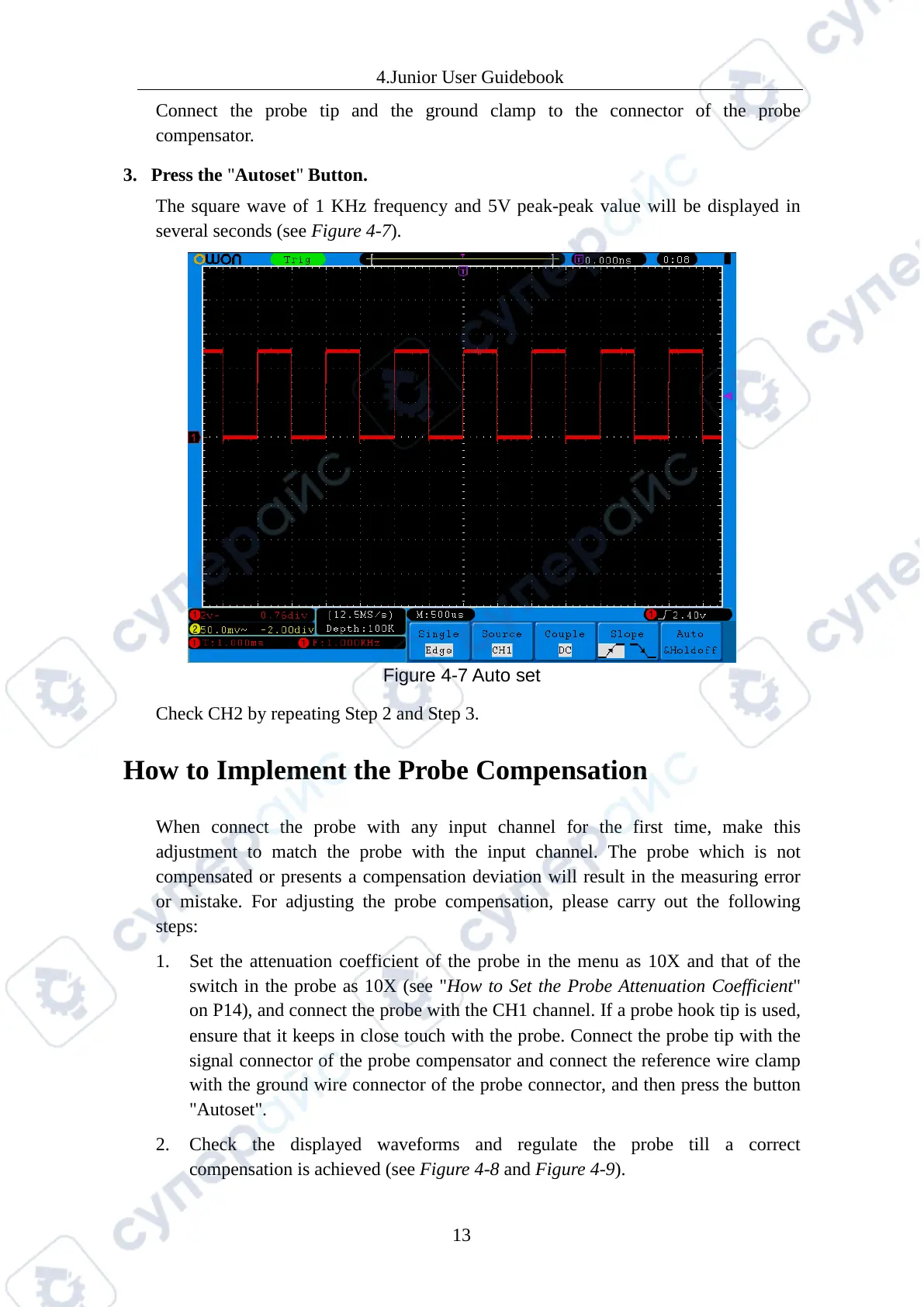 1. Set the attenuation coefficient of the probe in the menu as 10X and that of the