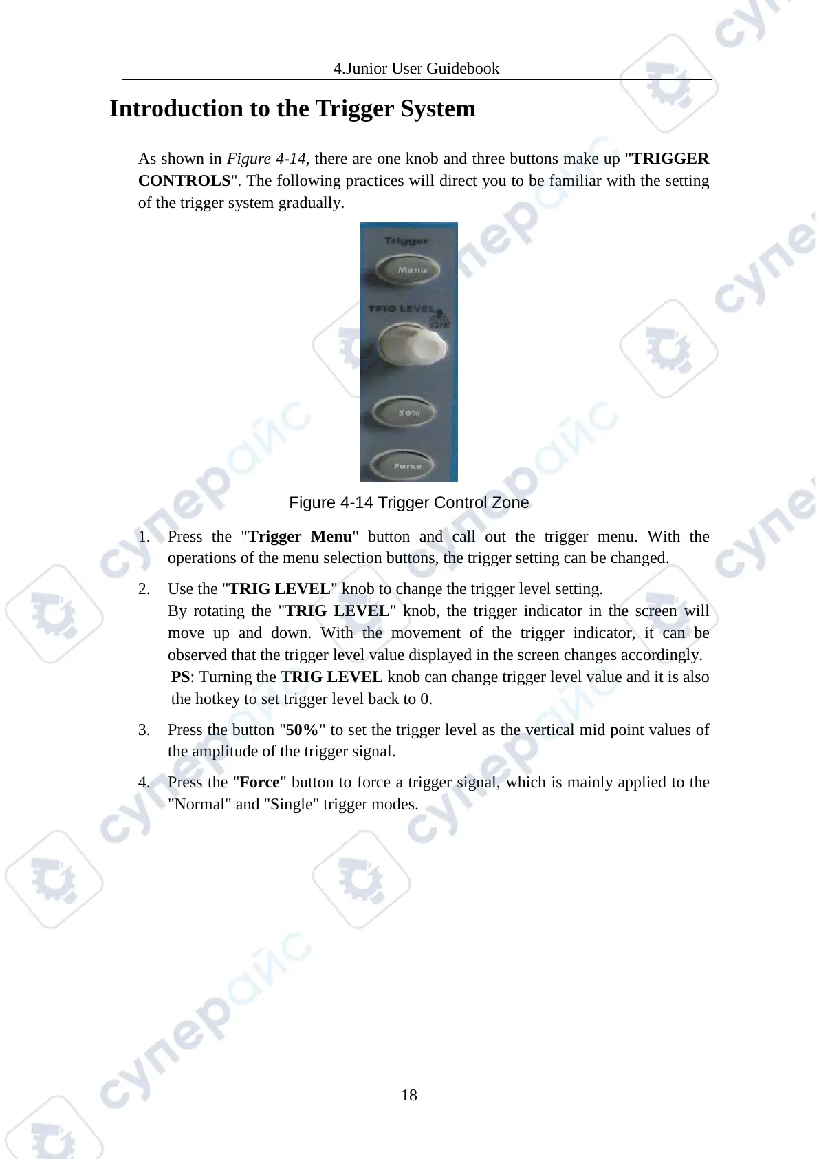 As shown in Figure 4-14, there are one knob and three buttons make up "TRIGGER