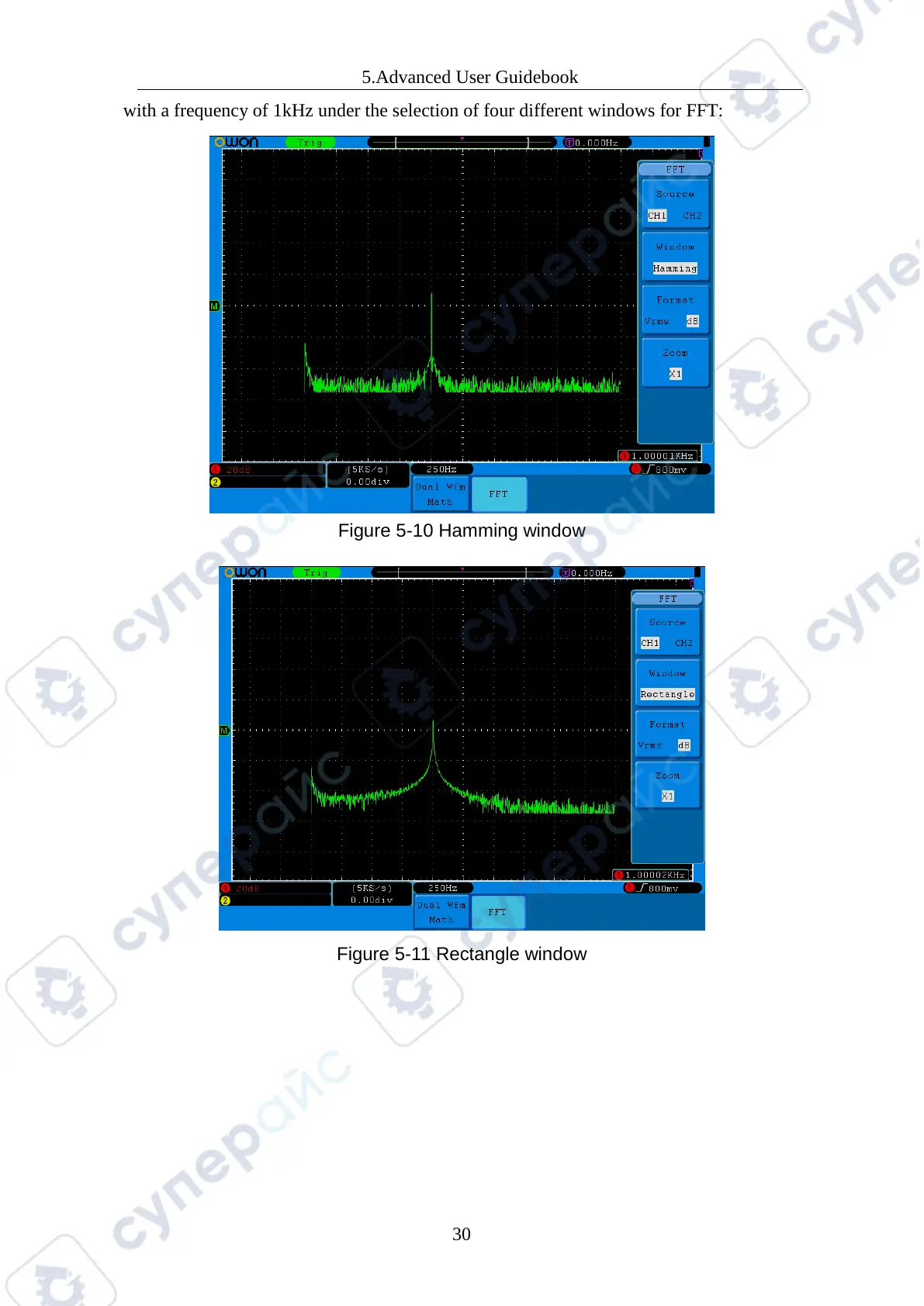 with a frequency of 1kHz under the selection of four different windows for FFT: