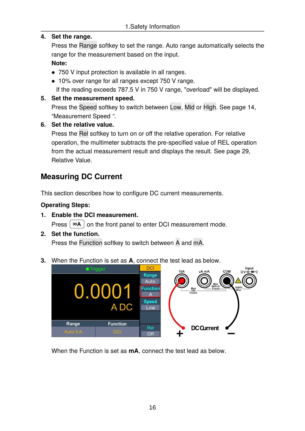 Press the Function softkey to switch between A and mA.