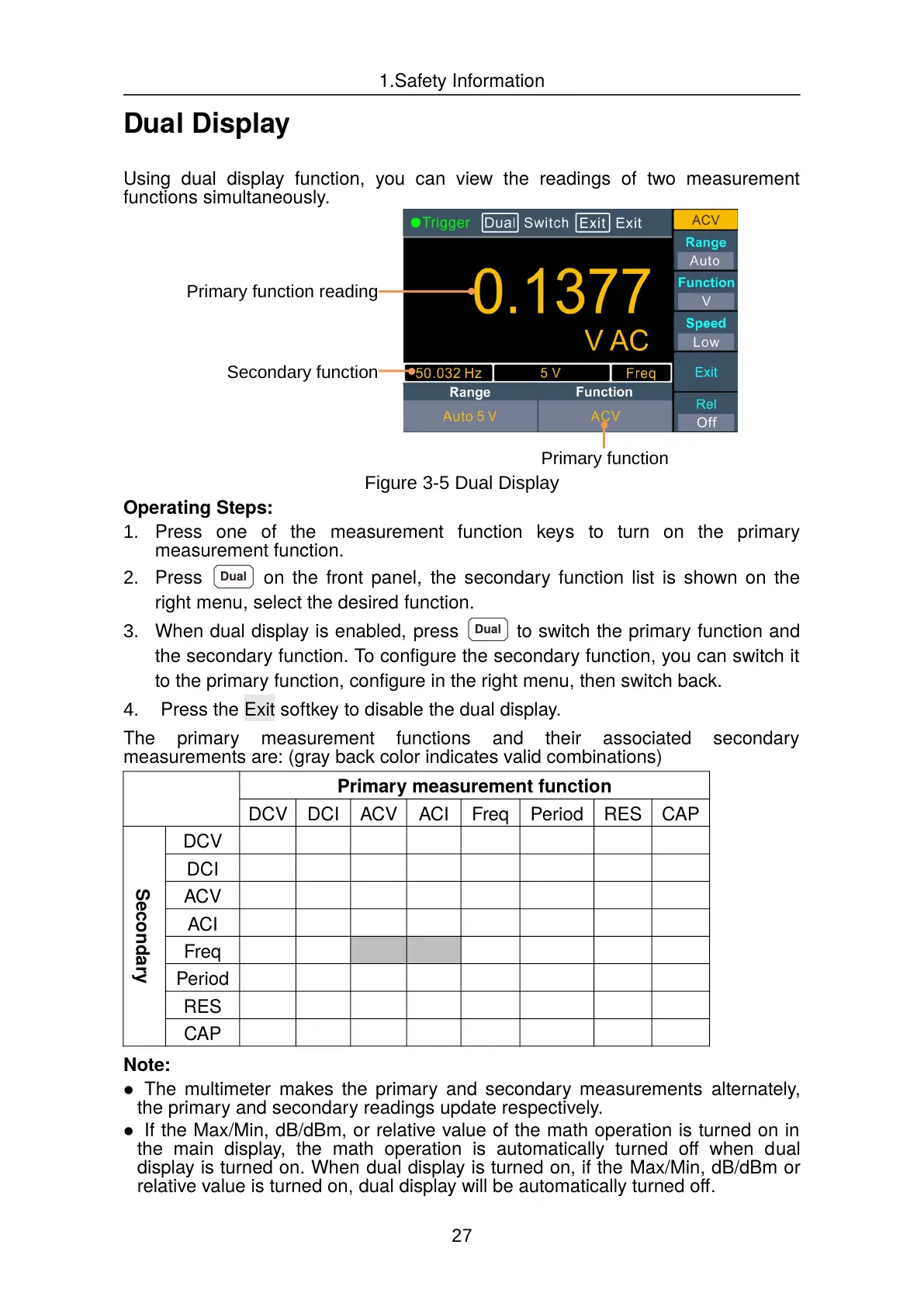 Using dual display function, you can view the readings of two measurement
