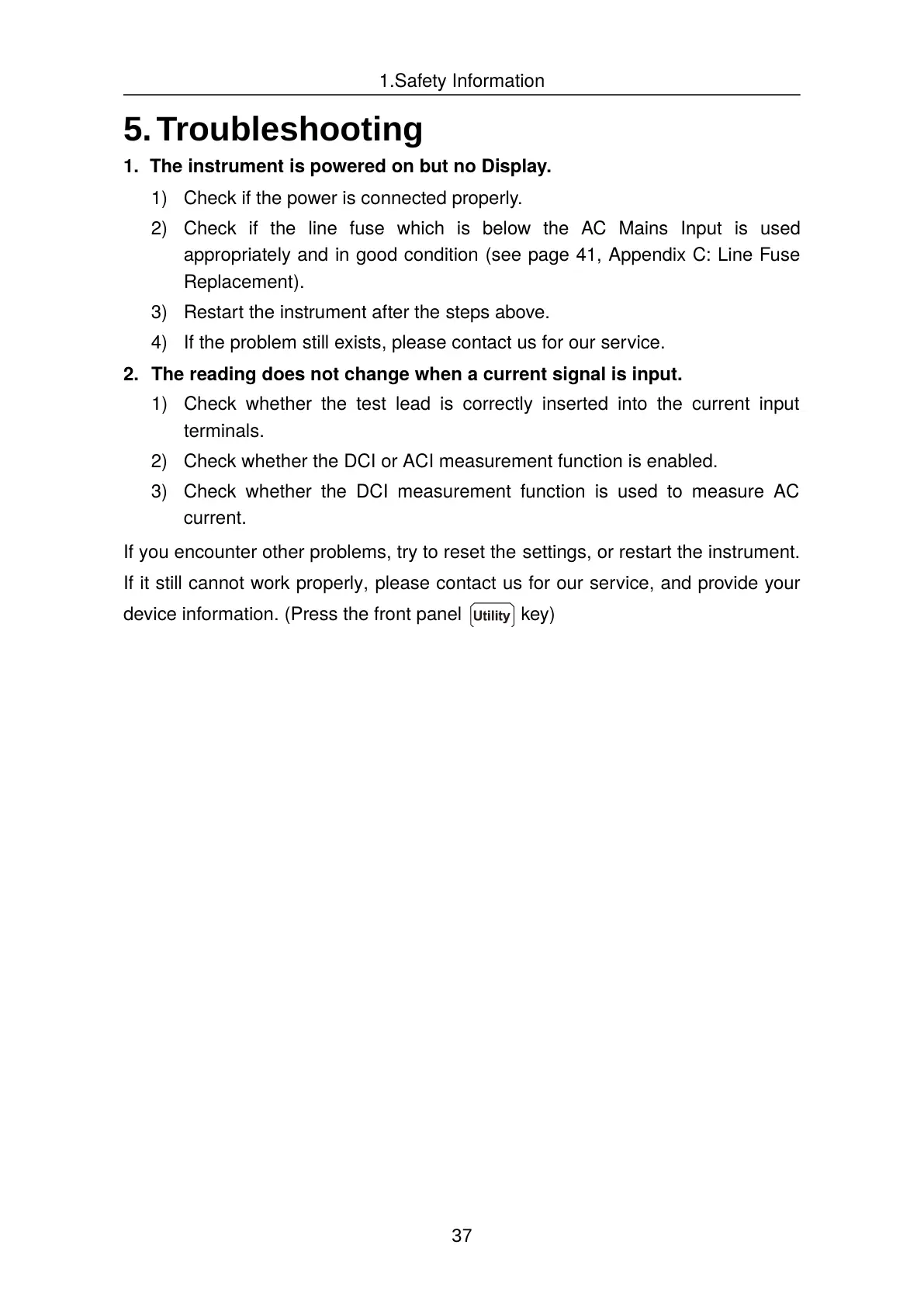 If you encounter other problems, try to reset the settings, or restart the instrument.