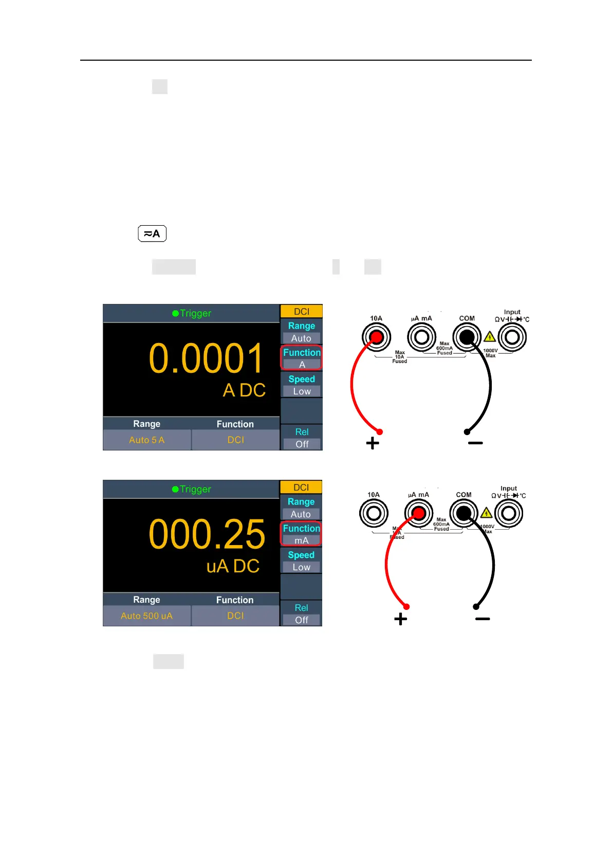 3. When the Function is set as A, connect the test lead as below.