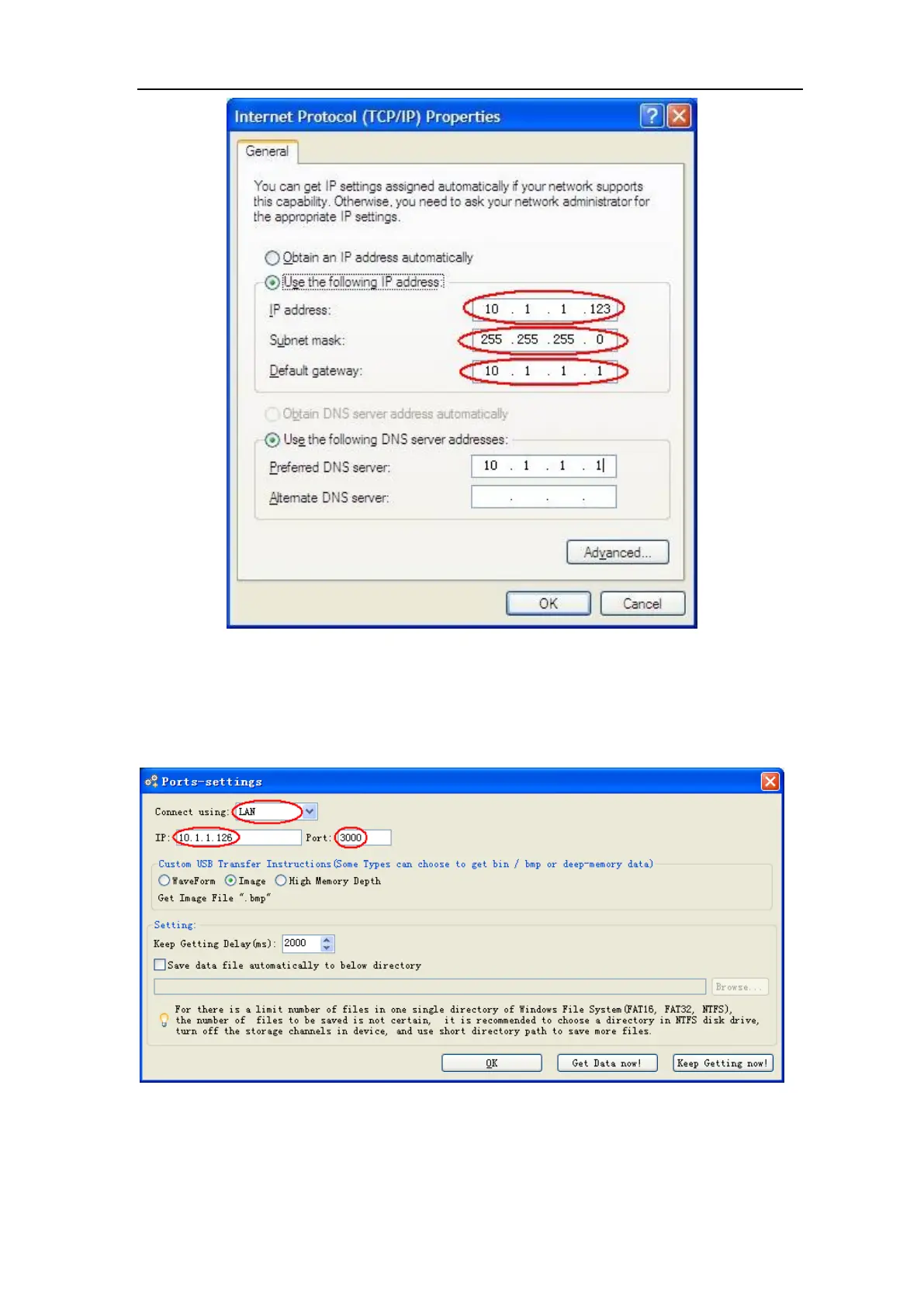 (8) Set the network parameters of the Oscilloscope Software. Run the software on the