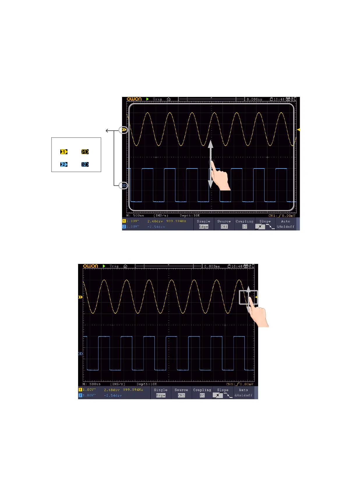 Select a channel (CH1 or CH2 button): Touch the pointer on the left side of