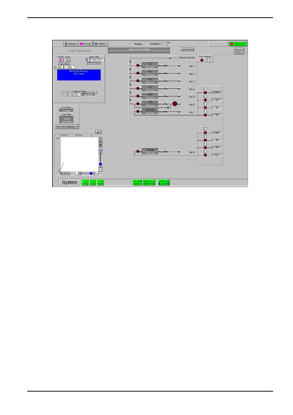 The leak detection page, accessed from the Chamber 1 process page by selecting the Leak