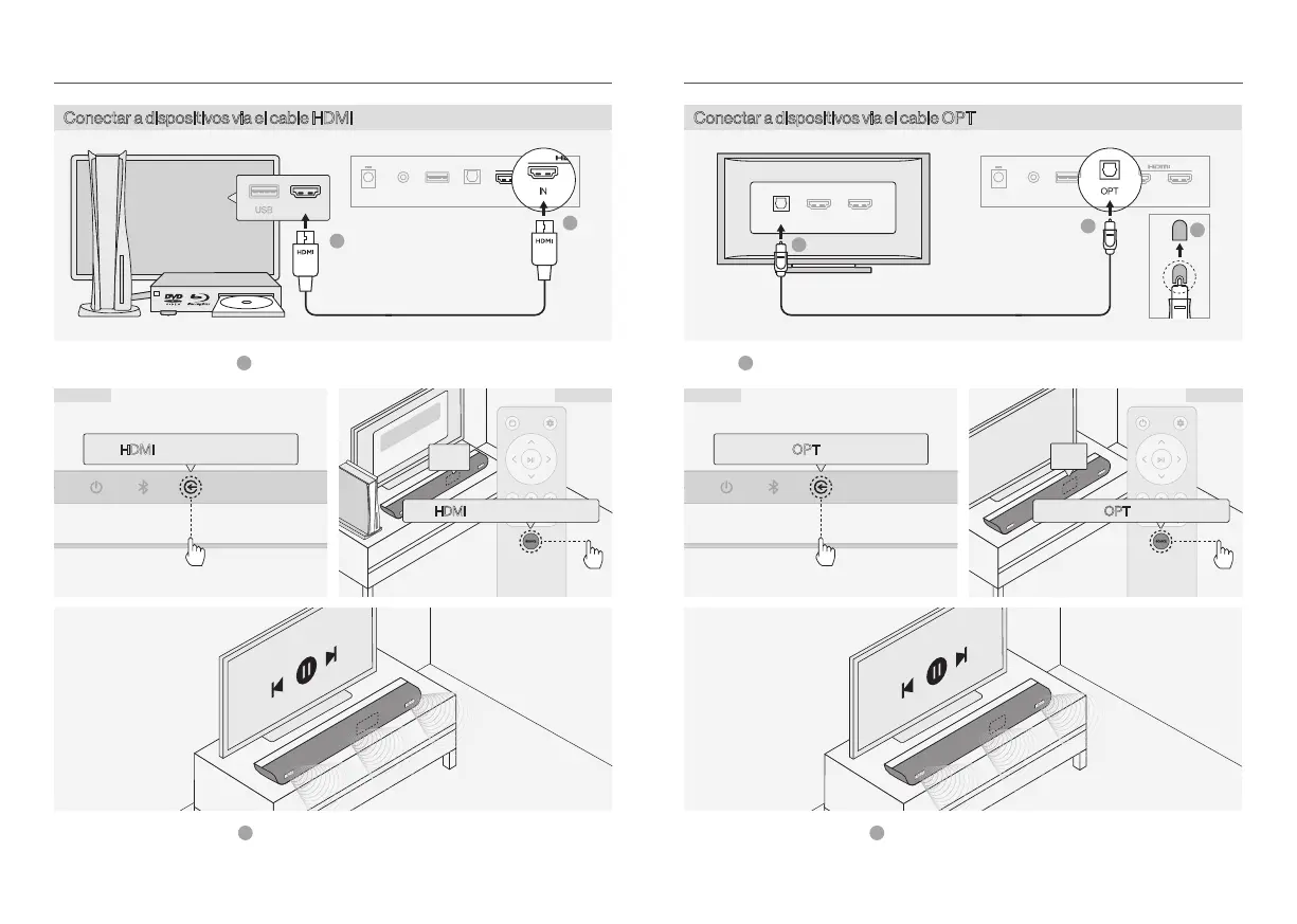 Conecte los dispositivos y soundbar utilizando el cable óptico.