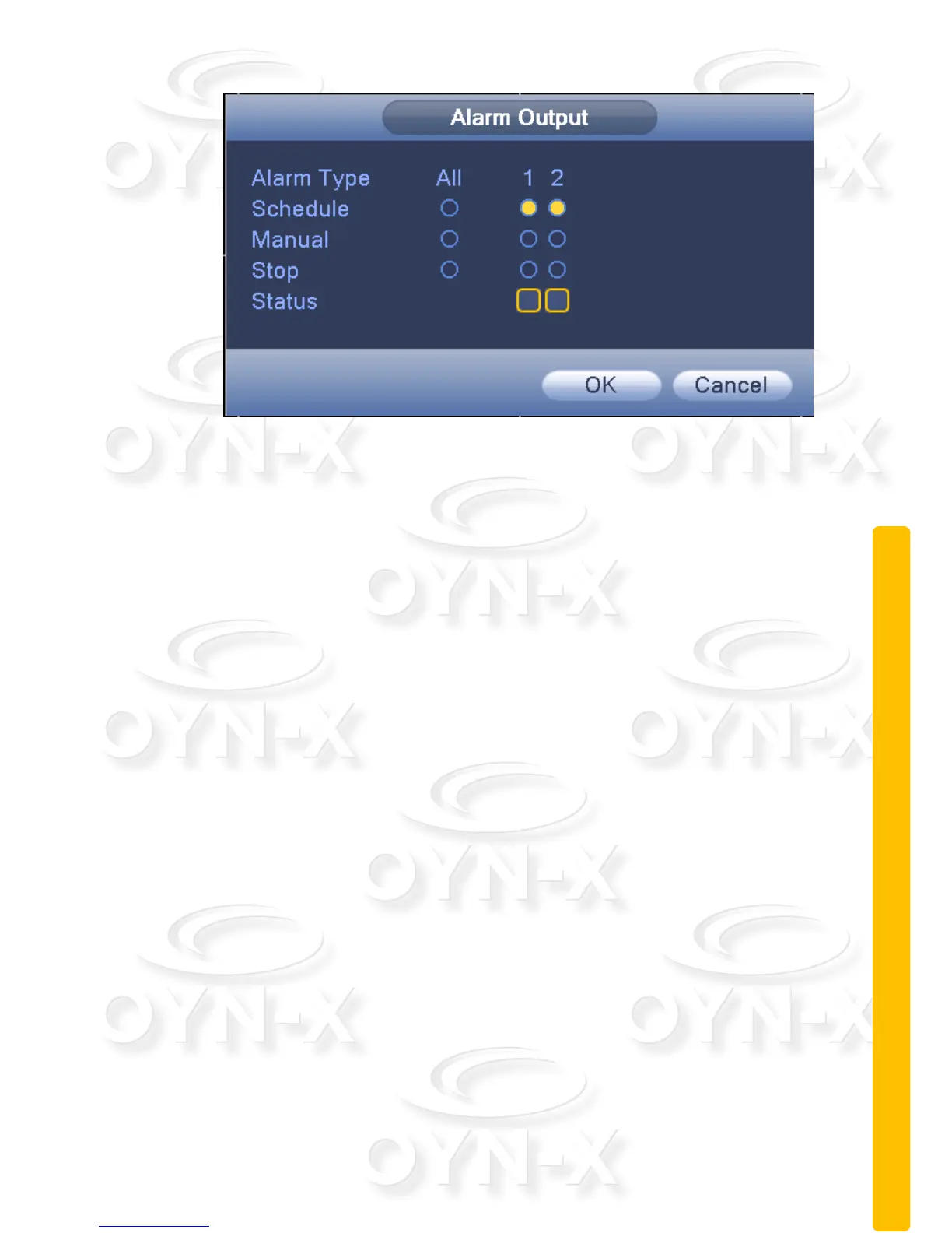 [Stop]: regardless of what state the system is setup the alarm output feature