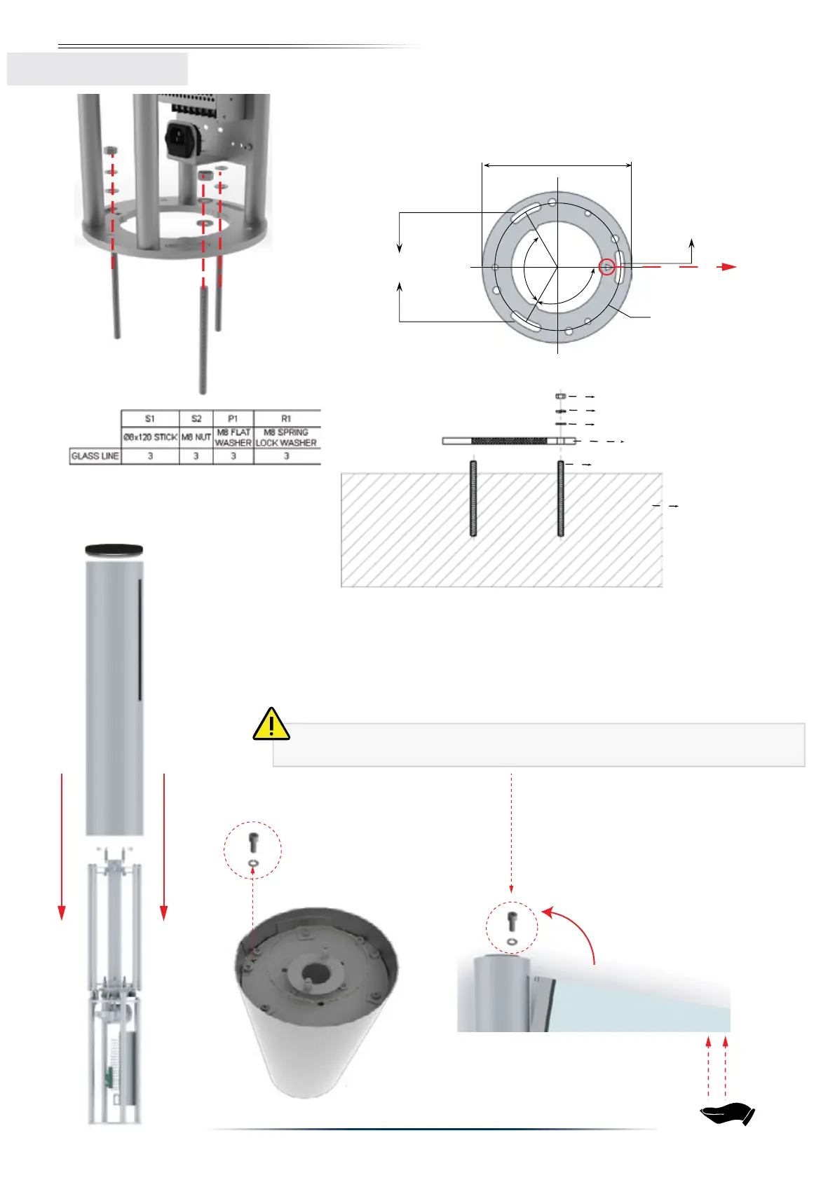3. Place turnstile on anchoring bolts and tighten the nuts to secure in place. Pay attention to