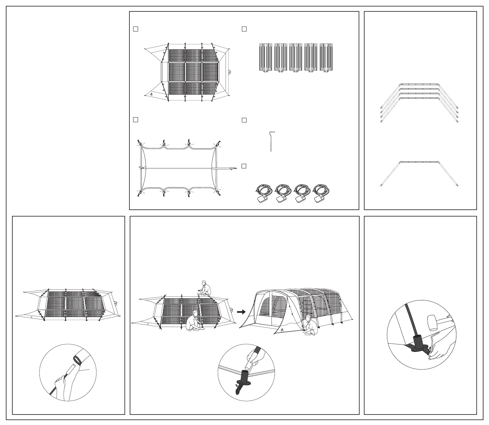 1) With a person holding each end of the front pole (B), flex the pole into an arch. Carefully