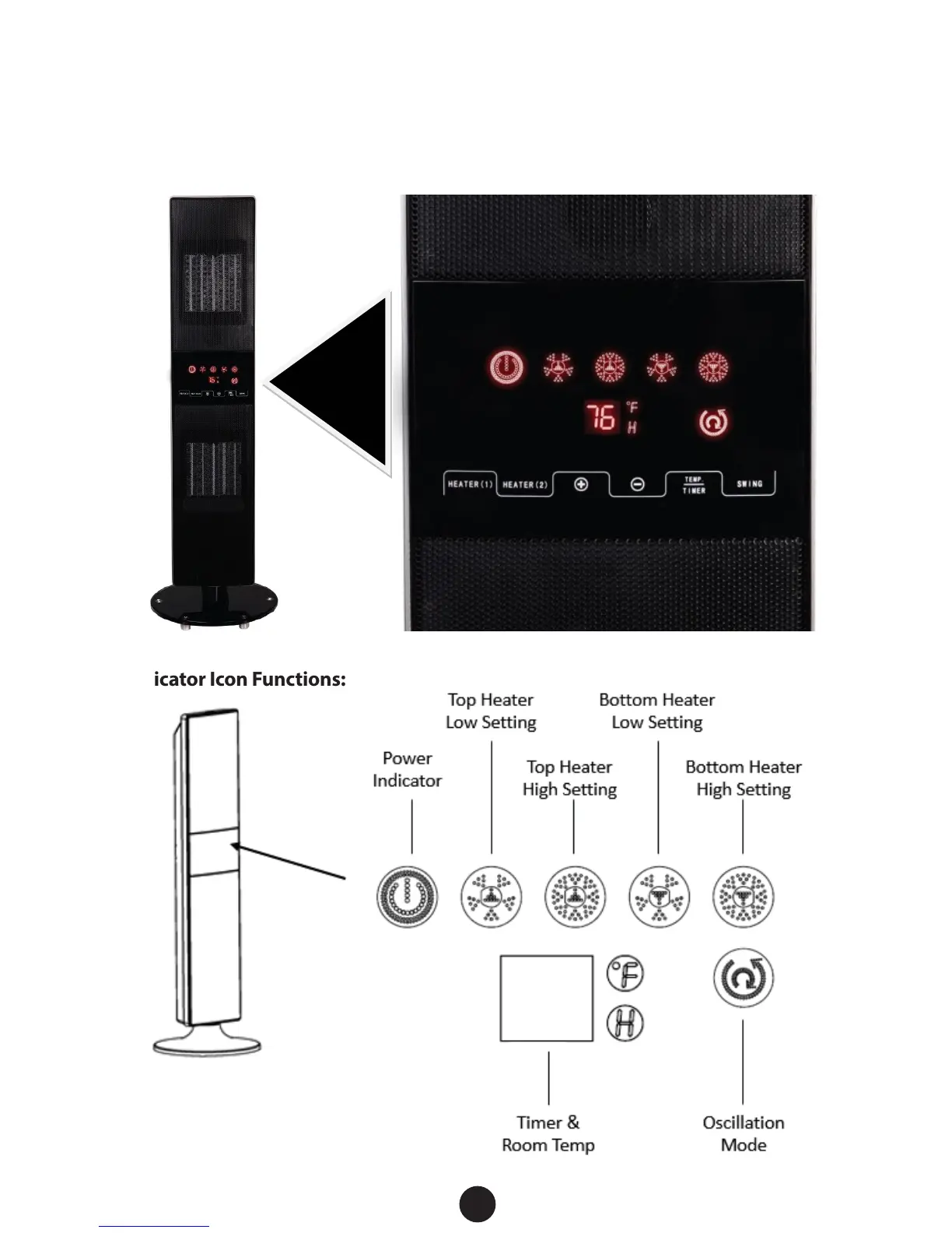 To engage the heater and fan’s oscillation, press the SWING button on the far