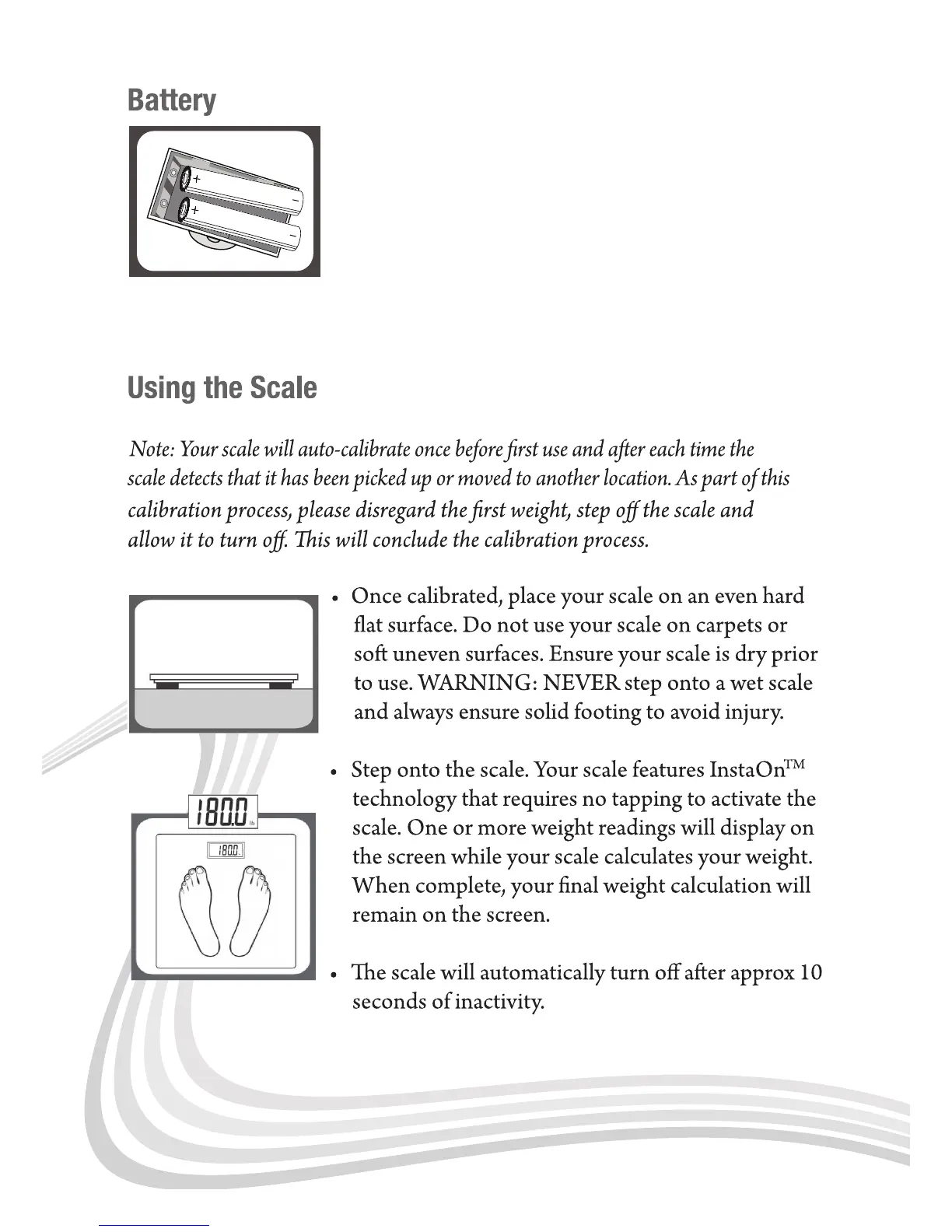 Ozeri ZB18 - Battery Installation; Inserting Batteries; Using the Scale; Scale Calibration and Placement