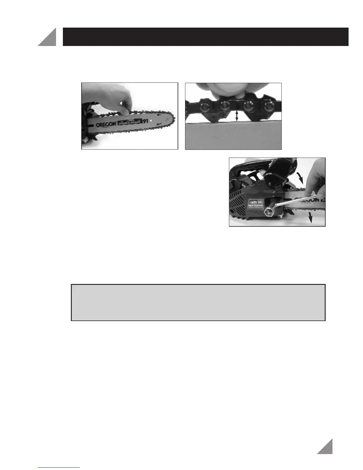 12. To get the correct chain tension, firmly pull up on the chain at the middle of the top