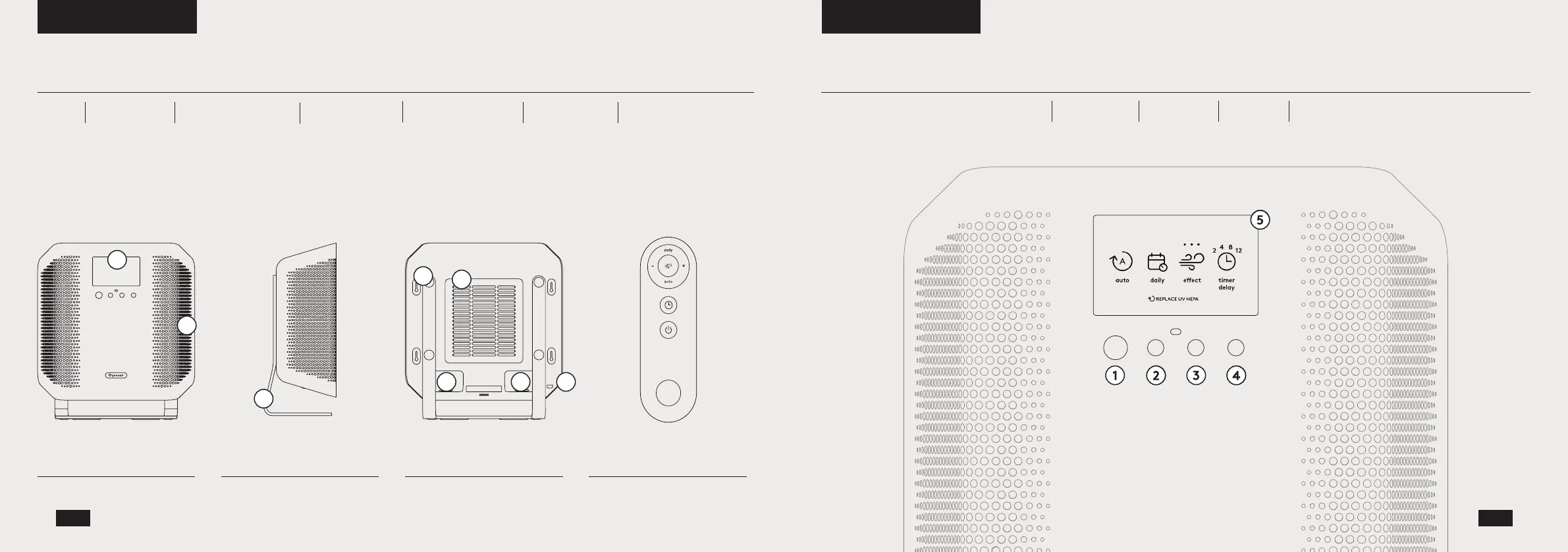 1. Display 2. Uscita dell’aria 3. Supporto del prodotto 4. Supporto a muro 5. Sportello lampada UV 6. Fonte di energia 7. Filtro HEPA + presa d’aria