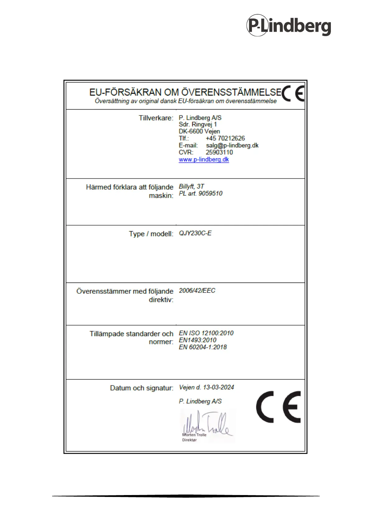 P.Lindberg QJY230C-E - EU-FÖRSÄKRAN OM ÖVERENSSTÄMMELSE