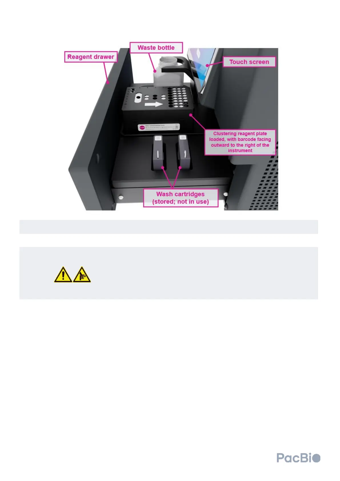 Do not place your hands or fingers in or between the reagent drawer and cluster