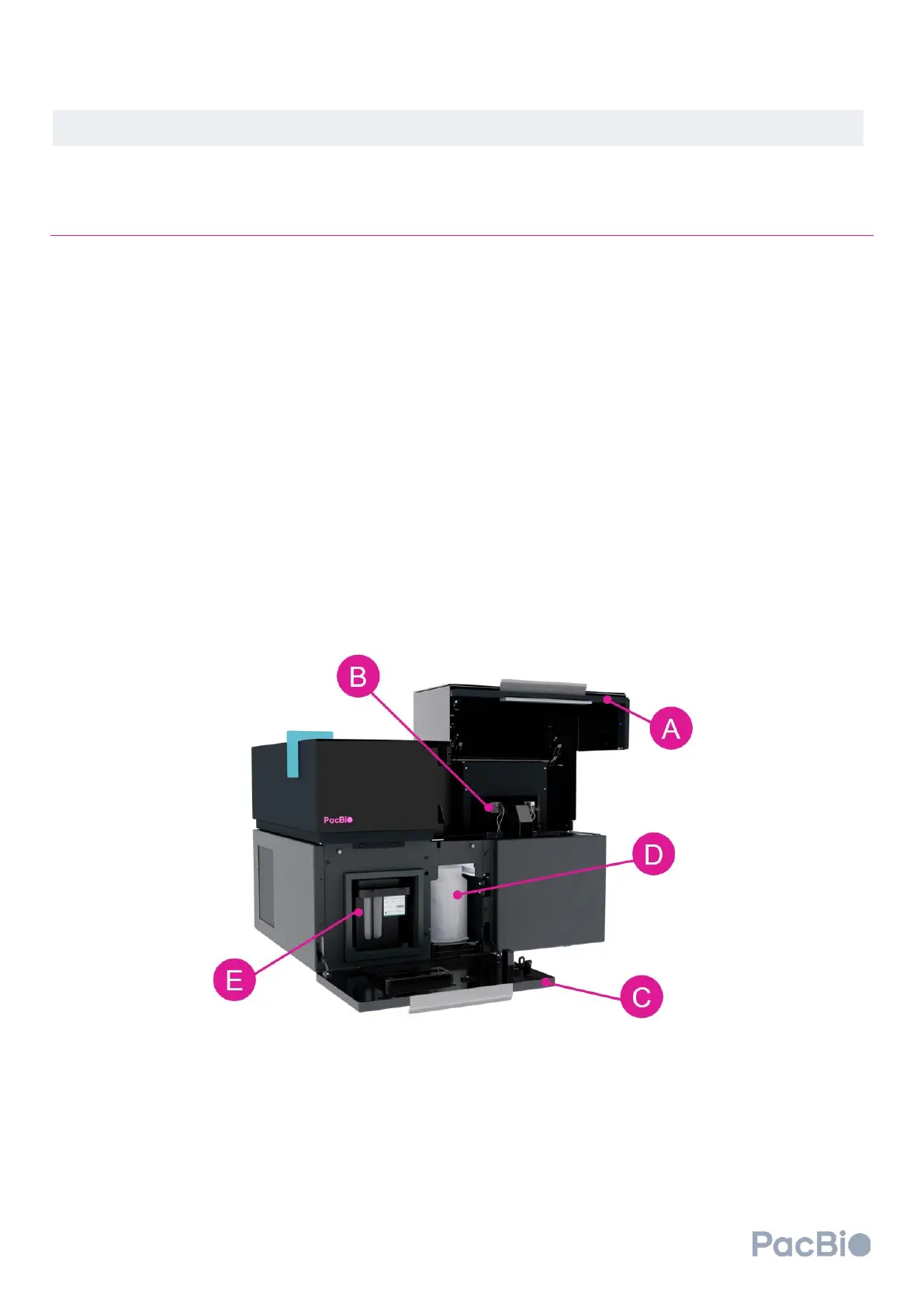 software to unlock the (C) reagent door, which opens toward the user. The (D) waste container and (E) sequencing
