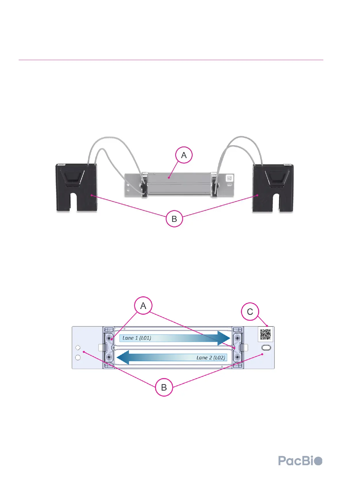 right side contains one. A QR code (C) on the upper right corner contains flow cell information and indicates the
