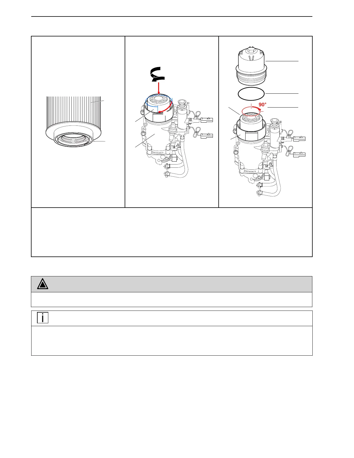 3. Rotate the fuel filter element (2) an additional 90° (4) in the fuel filtration module.