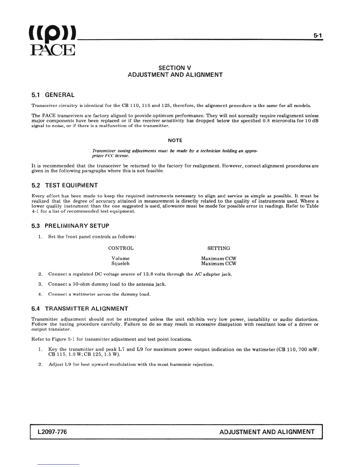 Pace CB 110 - Adjustment and Alignment; Test Equipment; Preliminary Setup; Transmitter Alignment