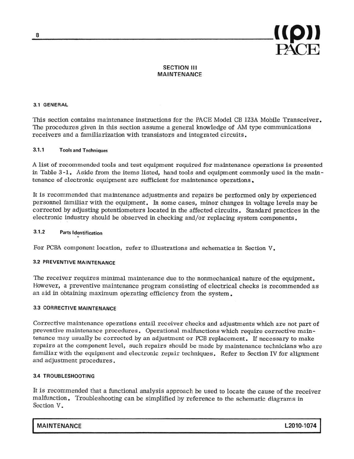 Pace CB 123A - Maintenance; Section III Overview; Tools and Techniques; Parts Identification