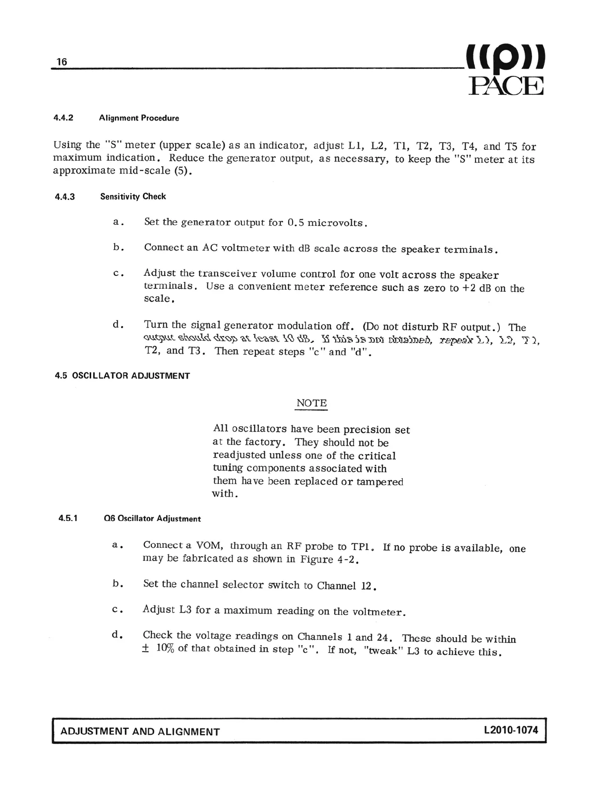 Pace CB 123A - Receiver Alignment Steps; Receiver Sensitivity Check; Oscillator Adjustment; Q6 Oscillator Adjustment